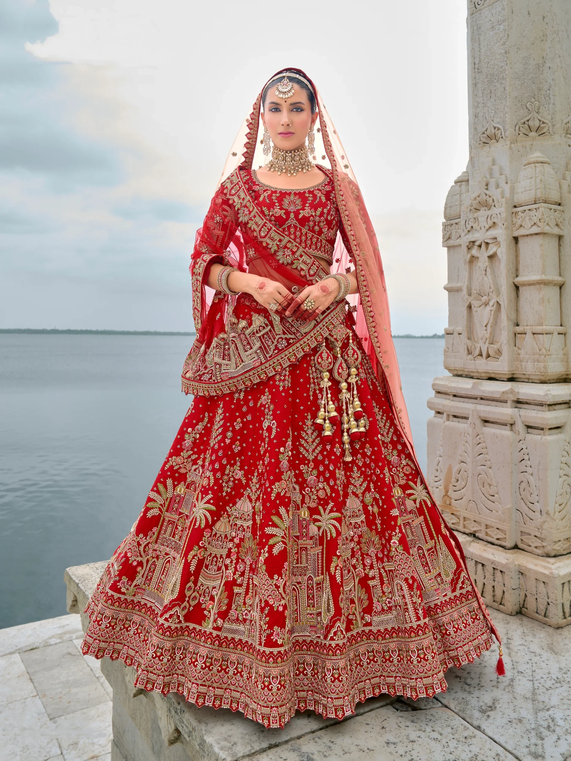 কারচুপি কাজের ভেলবেট মেটেরিয়াল এর ব্রাইডাল লেহেঙ্গা। আমাদের লেহেঙ্গাতে পাবেন ফুল গেড় ও কাজের অসাধরন কাজের ফিনিশিং এবং সঠিক দাম।
